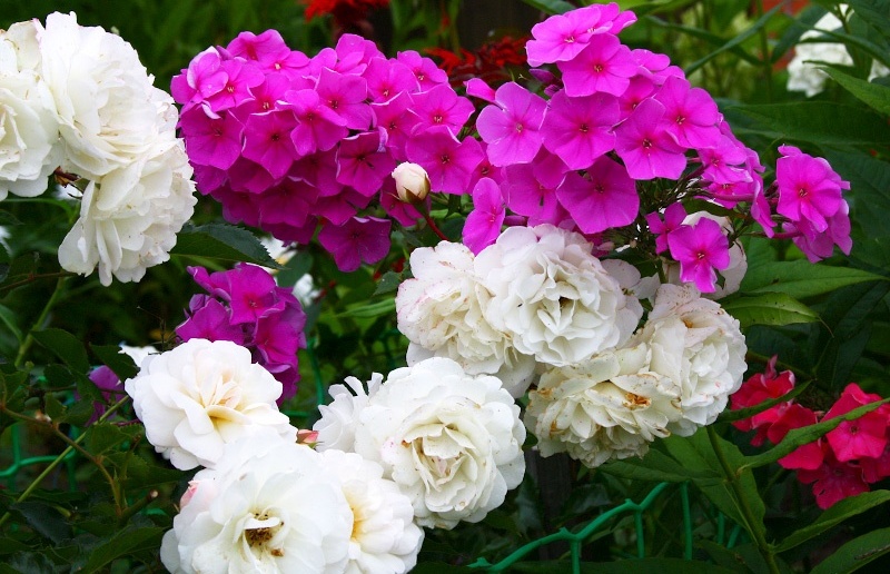 Также стоит отметить, что у этих двух культур схожие болезни, только роза ими заражается раньше и тем самым садовод может предотвратить заболевание винограда, вовремя его обработав. Очень часто эту пару высаживают вдоль беседки соблюдая расстояние между саженцами винограда 2,5-3 м. , а как раз в это место органично вписывается плетистая роза. Укрытия на зиму требуют не только розы, но и виноград, их можно укрыть вместе предварительно сняв с опор. Розы и дельфиниум Розы очень красиво смотрятся на фоне разноцветных дельфиниумов. Только надо помнить, что дельфиниум высокорослое растение и рядом с ним необходимо сажать высокие розы, а иначе цветы погибнуть от тени дельфиниума. Розы и флоксы Метельчатые флоксы станут хорошим фоном для низкорослых цветов и прекрасным бордюром для высоких. Плюсами флоксов является то, что их корневая система не слишком углубляется в почву и можно при необходимости без нанесения ущерба розам их отсадить. Также флоксы не прихотливы и продолжают свое цветение, когда розы уже давно увяли.